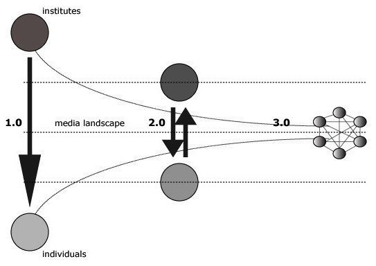 Het illustreert de veranderde communicatie tussen instituten en individuen. In 1.0 is die hiërarchisch en eenzijdig: het instituut zendt, het individu ontvangt. In 2.0 is er minder hiërarchie en meer interactie. In 3.0 is de hiërarchie verdwenen en communiceren de spelers gewoon met elkaar, maar wel elk met een eigen rol.
