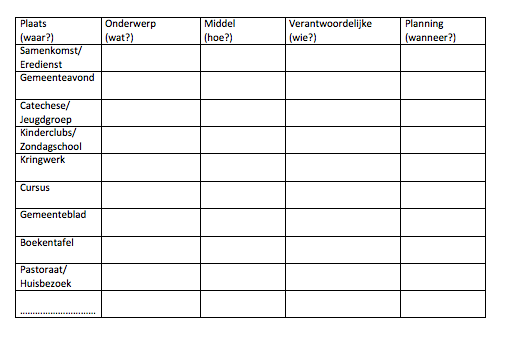 In fase IV van de planningscirkel is er vooral aandacht voor de toerusting van de gemeente. Met behulp van het onderstaande schema kun je de mogelijkheden tot gebedstoerusting inventariseren. Je kunt ook in een gemeentebrede bijeenkomst een korte presentatie (laten) geven van ieders voornemens en vervolgens daarover in gesprek gaan.